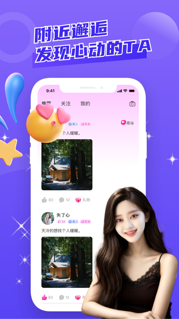 在附近去约会,用户可以免费查看同城的异性资料,选择喜欢的异性,随时搭讪;还可以用文字聊天、语音通话、视频通话等多种形式拉近自己与心动异性的心灵距离。